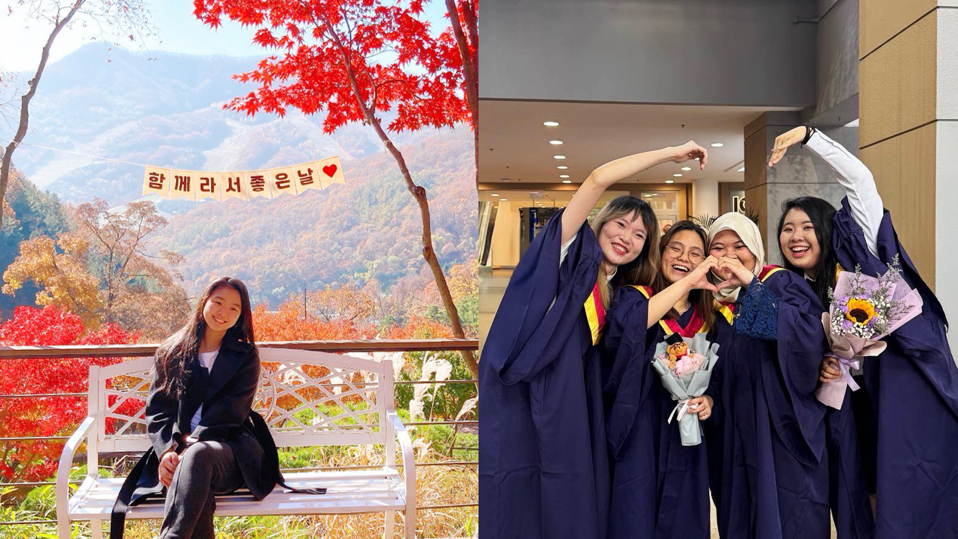 Left: Megane Wong in Korea for Overseas Exchange Programme (OSEP). Right: Megane Wong with her best friends during graduation.